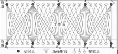 无线电波按照频率分类属于电磁波的低频率,而电磁波是能量的一种形式,通过不同介质时,会发生折射、反射、散射、绕射及吸收等,从而导致能量的消耗。由于井田内地层都是由多种不同的煤岩层组成的,而各种不同煤岩层的电性不同,因此,根据煤岩层对电磁波的能量吸收不同,可以根据煤岩层的吸收值区分不同的煤岩层。所以说,电磁波在地下煤岩层中传播时,电阻值低的煤岩层对电磁波的传递渗透具有很强的吸收作用,当电磁波穿过煤岩层过程中遇到断层和陷落柱等地质构造时,电池波的能量被吸收或屏蔽,从而导致仅能收到微弱信号或收不到信号,形成所谓的透视异常区。所以说,通过研究不同煤岩层和地质构造对电磁波的能量吸收影响所造成的各种透视异常区,可以进行地质资料推断和解释。