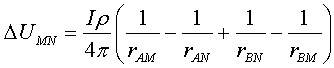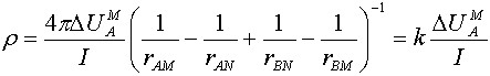 矿井直流电法勘探是矿井地球物理勘探的重要分支,它以岩石导电性差异为基础,通过测量和分析巷道或采场附近稳定电流场的分布变化规律来研究矿井地质问题。根据场论可知,当三维空间内充满均匀同向介质时,如果在内部A点供电,M点处的电位值为: