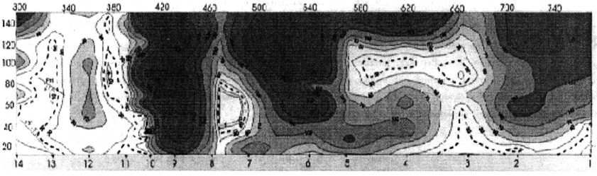 由于巷道电测深曲线类型本身的复杂性,加上巷道空间、铁轨、直接出露的断层带的影响,以及强烈的地电干扰,实测电测深曲线往往畸变严重,有时呈剧烈的锯齿跳跃,因此解释时不能象地面电测深曲线那样与各层电阻率相对大小关系一一对应,更不能仅按单条曲线进行定性和定量解释。为此,常把视电阻率断面图作为解释的依据,根据视电阻率等值线的断面图的频谱特征,采用低通滤波对其进行数据处理,提取反映垂向分布的电性异常,消除或压制横向电性变化引起的地电异常。