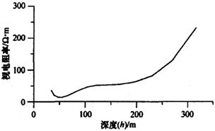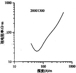 当有磁铁矿体赋存时,瞬变电磁测深曲线反映的基本形态呈HA型(图2),50m以上视电阻率曲线呈明显下降趋势,为第四纪地层反映;在60m处视电阻率最低,为第四系地层的底部;在60-150m范围内视电阻率呈明显上升趋势,为第四纪下伏基岩的反映;150-250m范围内视电阻率变化范围较小,中部曲线呈A型,测点下方可能存在有低阻异常体,推测为地层含铁矿体的反映;在250m以下视电阻率变化极快,呈快速上升趋势,推测为太古宙地层的反映。无铁矿体赋存时(图3),其曲线类型为H型。