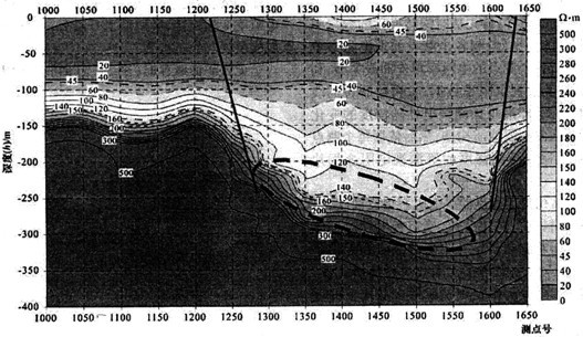 从横向上(地层走向)分析,图中上部(在-100m以上)视电阻率等值线平滑,上下波动范围较小,说明了该段地层横向上沉积较为稳定,为第四纪地层反映。而图中中部可看到一明显的等值线向下弯曲带,推测为断层反映[5]。横向上在1250测点和1600测点之间有相对低阻区域存在(见图中椭圆圈出区域),说明了此处存在一低阻异常体,结合钻孔资料以及异常点的划分,可推测出该异常体为铁矿体引起的[6]。