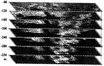 为了解地质体及铁矿体在平面上的分布情况,根据断面图反映的电性异常,做出不同深度的视电阻率水平切片图(图5)。
