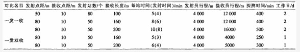1 “一发双收”观测方法“一发双收”方式的目的是提高现场工作效率,可在一个工作日内完成长度1 500-2 500m工作面,充分利用发射机。一台发射机正常工作时间在5个小时以内,只有一台接收机在接收数据,很多时间发射是不能充分利用。“一发双收”装置是由一台发射机和两台接收机组成,其中两台接收机需要校正,在同一点接收的场强值应该一致或差值低于ldB。“一发双收”方法,即一台发射机发射,两台接收机接收数据,每台接收机只采集一半数据。接收机操作员可以不用往回走或者往回走的很少,这样可以大大缩短探测时间、减轻操作员的劳动强度,保证仪器正常工作。以2 000m的工作面为例,两种数据采集方式主要参数比较(表1)。可以看出来,一发双收较一发一收具有接收操作员行程少和探测时间少的优点。但是,一发双收比一发一收需要多一个接收仪器操作员。