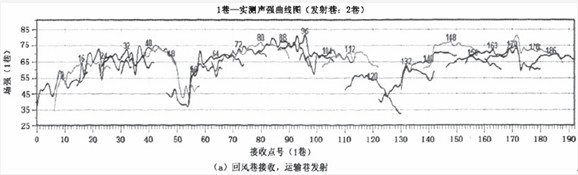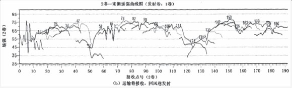 现场在运输巷和回风巷共布置48个发射点。对每个发射点接收22个实测场强值,每台接收机采集11个数据,其中在同一个接收点的数据是做校验值,不能跳跃太大。发射点间距平均为80m,接收点间距10m,每个发射点对面巷道200范围接收场强值。从实测场强曲线图(图3)可以看出,两台接收机采集的数据没有出现跳跃,说明两台接收机采集的数据误差很小,数据是有效的。其结果表明,现场工作效率提高一倍,数据量增加一倍,为数据处理提供基础。
