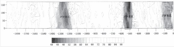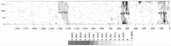 从图3-图5分析:退尺0-100m、480-560m和1 200-l 300m段表现为较高的电磁波吸收系数。主要为断层或裂隙影响。参考巷道已经揭露的地质条件,探测画出该工作面三个主要异常区:l#异常区在退尺20-100m处为断层影响区;2#异常区退尺480-560m处为断层影响区;3#异常区在退尺1200-1300m处为断层和薄煤影响区。目前该工作面探测区已经回采,探测结果与实际回采验证结果比较吻合,说明一发双收的探测方式是可行的,为无线电波透视提供了一个新的数据采集方式。4 结论