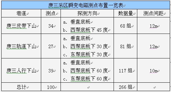 现场探测时,分别在庚三皮带下山,庚三轨道下山,庚三人行下山布置测线,如表3-1庚三采区瞬变电磁测点布置一览表。庚三皮带下山在9#测量点位置开始至皮1#测量点结束,庚三轨道下山在轨2#测量点位置开始至14#测量点北20m结束,庚三人行下山在11#测量点位置开始至庚三人行下山与庚三下车场交叉口北10m结束,见图3-2垂直三条巷道平面测点布置图。