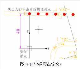 根据探测探测方案设计要求及具体施工中测线和测点的布置条件,将庚三皮带下山走向轴定义为X轴,垂直庚三皮带下山的轴定义为Y轴,庚三人行下山开始物理测点Y轴负方向40m处定义为坐标原点,详见图4-1坐标原点定义。