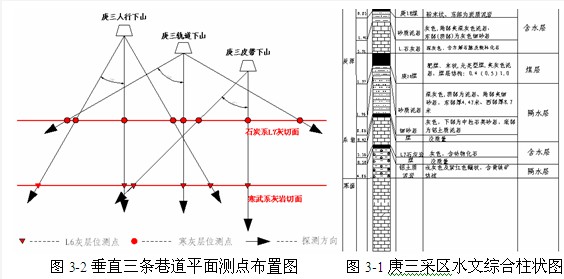 庚三皮带下山在庚20煤层中施工,庚三轨道下山在庚20煤层上10~12m的岩层中施工,庚三人行下山在庚20煤层上30m左右的岩层中施工,太原组L7灰岩在庚20煤层底板下8~10m位置,寒武系灰岩在庚20煤层底板下25~30m位置,如图3-1庚三采区水文综合柱状图所示。庚三皮带下山与庚三轨道下山平距30m,庚三皮带下山与庚三人行下山平距30m,经过高差换算后之后在三条巷道里设计按照一定的方位进行多方位换算,可以对以庚三皮带下山为轴分别底板下L7灰岩层、寒武系灰岩层位东西各60m范围,南北一定范围(根据三条巷道的长度而定)灰岩水发育情况及连通性进行评价。