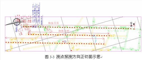 其中庚三皮带下山每个测点分别进行垂直底板方向,西帮底板下45度方向探测;庚三轨道下山分别进行垂直底板方向,东西帮底板下30度方向探测;庚三人行下山分别进行垂直底板方向,东西帮底板下60度方向探测。根据三条巷道同一切面八个不同探测方向,结合高差经过角度换算可以在L7灰层位横向有8个有效物理控制点,在寒武系灰岩层位横向有6个有效物理控制点,纵向以三条巷道测线长度为控制范围,见图3-3测点探测方向正切面示意图。