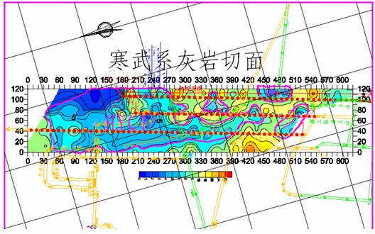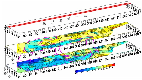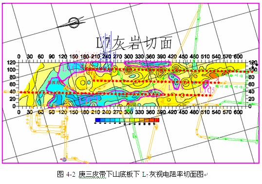 本次探测数据处理时将庚三人行下山、庚三轨道下山、庚三皮带下山三条巷道中8个探测方向的原始数据进行晚期视电阻率计算、时深转换后得到的数据体再进行提取并组合后分别形成反映庚三皮带下山底板下一定范围内L7灰岩与寒武系灰岩层位电性特征的切面。