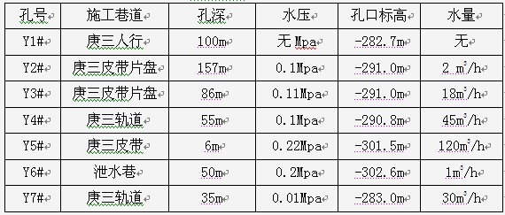 此外在对庚三皮带下山出水点周围的物探异常区进行底板注浆加固,注浆孔一排施工5个孔,孔间距1m,排距5m,注浆孔终孔层位在L7灰岩11m左右过程中,注浆孔有的出水有的未出水,其中单孔水量最大在150m3/h左右 。