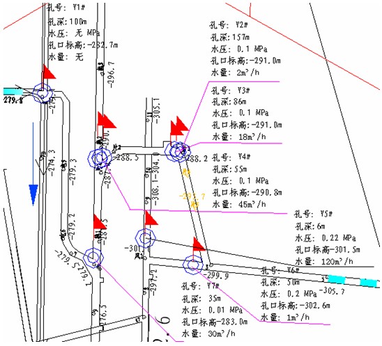 (2)矿方依照本次探测结果设计了庚三皮带下山防治水方案,以保障庚三皮带下山的安全掘进。在之后的防治水及庚三皮带下山的掘进过程对物探成果进行了验证。其中在庚三皮带下山周边分别施工Y1#~Y7#探水孔。详见表5-1庚三皮带下山周边探水孔一览表及图5-1庚三皮带下山周边探水孔布置图。其中Y2#、Y3#探水孔为在后期施工的庚三皮带片盘施工,该区域当时未进行物探,其他探水孔均在物探圈定的异常区进行施工。