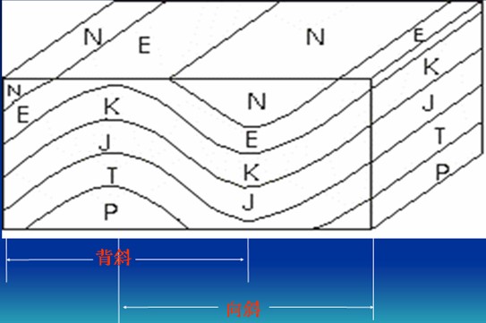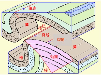 为了正确地描述和研究褶皱,首先要了解褶皱的各个基本组成部分(也就是褶皱的要素)以及各组成要素之间的相互关系。褶皱的主要要素有:①核部:指褶皱中心部位的岩层,简称核;②翼部:指褶皱核部两侧的地层,简称翼;③枢纽:在褶皱的横剖面上,同一褶皱岩层的各最大弯曲点的连线叫枢纽;④轴面:一个褶皱内各相邻褶皱面上的枢纽连成的面,它是大致平分褶皱两翼的对称面;⑤轴迹:褶皱轴面与地面的交线;⑥转折端:褶皱一翼向另一翼过渡的的部分;⑦脊、脊线、脊面;⑧槽、槽线、槽面;⑨脊迹和槽迹。如图三所示。