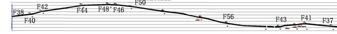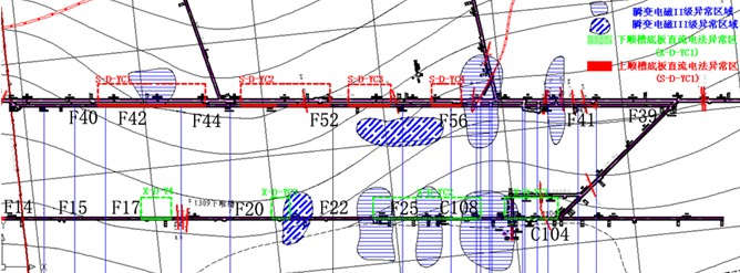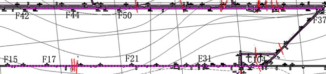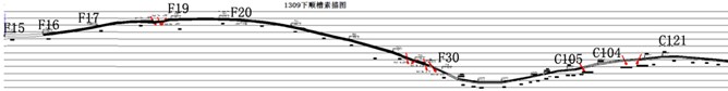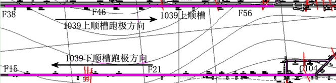 1309工作面上顺槽及下顺槽现场数据采集自2012年09月01日至2012年09月02日完成。上顺槽测线自导线点F38处开始,共采集12站数据;下顺槽探测自导线点C104处开始至F15处,共采集15站数据;每次共布置18个电极,其中16个为测量电极、一个N极、一个B极,每相邻两个测量电极之间的间隔为4m,每站跑3次极。本次探测导线点F38+750m后面的巷道由于受巷道底板积水等原因无法进行探测;1309工作面下顺槽底板探测施工范围为导线点C104至F15,探测范围见图3-2。