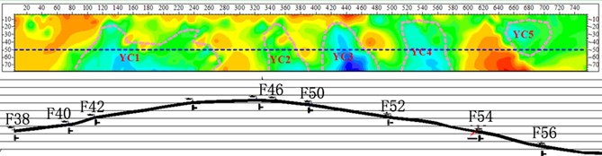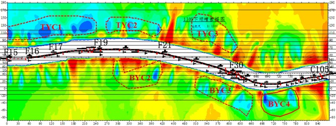 图4-3为1309工作面上顺槽巷道底板应用YDZ16(A)矿用并行直流电法仪所获得底板方向视电阻率等值线图,颜色自蓝色向红色过渡,冷色表示低阻异常;图4-4为1309工作面下顺槽底板直流电法探测视电阻率等值线图。如图所示,YC1、YC2、YC3、YC4、YC5为上顺槽底板相对富水异常区,XYC1、XYC2、XYC3为下顺槽底板相对富水异常区。