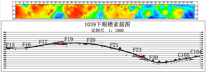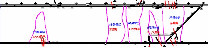 (二)构造异常情况探测结论:在1309工作面内,上顺槽距离F38点900~970m以及下顺槽距离F15点560~650m范围内为断层影响区,其异常区异常程度H>煤厚,断层及裂隙带发育、局部煤层有所变薄,对工作面的回采影响较大;上顺槽距离F38点830~880m以及下顺槽距离F15点140~250m范围内为断层影响区,该异常区异常程度H>1/2煤厚,断层及裂隙带发育、局部煤层有所变薄,对回采影响较小;下顺槽距离F15点660~740m范围内,为煤层变薄影响区,该异常区异常程度H>1/2煤厚,局部煤层有所变薄,对回采有一定影响,异常区可靠。