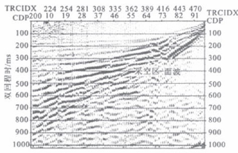 图4是已知煤层采空区上方裂缝处的地震记录。地表观察可见,桩号392处有宽3cm的小裂缝,桩号404处的裂缝宽l0cm,桩号416处的裂缝宽达30~40cm。这些地表现象显然是由地下煤层被采空,岩层发生形变所致。由图可见,桩号425处能量很强的基阶面波传播中止十分明显。