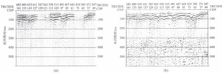 图6 已知采空区共偏移距地震剖面 (a-固定增值;b-Agc)