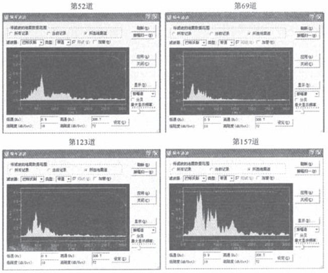 利用面波在煤层采空区传播中断并伴有散射波出现这一特点,可设计一种地震采集方式,即选择合适的偏移距,用小炮距(3m)激发,将得到的单炮记录抽成共偏移距炮集剖面。它与地震映像法不同之处是,一次采集可获得12条不同偏移距地震剖面,并以固定增益和Agc两种方式显示。图6是已知采空区采集的剖面。对地表观察有裂缝、塌陷处及经解释未确认为采空区的区段进行了频谱分析(图7)。由图6和图7可见: