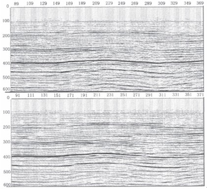 采用叠前与叠后相结合逐步提高分辨率。反褶积是地震数据处理中压缩子波、叠前提高分辨率的主要技术手段。本项目叠前主要采用地表一致性相位和振幅反褶积技术。该技术是对地震子波进行校正。消除地表不一致因素对地震子波的影响,从而增强地震子波的横向稳定性。经地表一致性反褶积处理后,由于地表因素变化而造成的子波振幅、相位的不一致性得到了较好的调整,剖面波组特征明显。