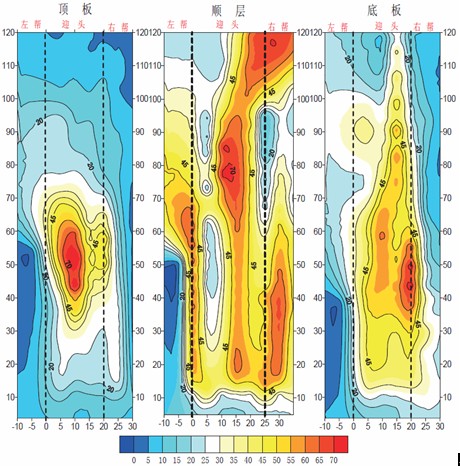 图2为10414风巷底板岩巷矿井瞬变电磁超前探测视电阻率等值线拟断面图:横坐标为测点坐标,纵坐标为沿探测方向距离。其中左图、中图和右图分别为顶板、顺层和底板方向探测结果。