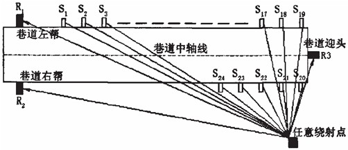 为了尽可能多的获取地震数据,MSP数据采集时选用三分量传感器。多个三分量传感器布置在不同位置,在巷道中形成全方位、多次覆盖观测系统。地面地震将界面抽象成光滑水平界面,每个CDP道集代表了某一共深度点多次反射。射线路径遵循镜面反射定理。MSP中将反射界面看成不再光滑而是由一系列离散绕射点所组成。因此该界面能够反射来自任一方向的下行波并且上行波总能被任何位置的传感器所接收。在巷道迎头和后方同时布置多个传感器接收,巷道一帮或两帮激发信号。前后置多次覆盖观测系统是将2只三分量传感器分别布置在巷道左右帮,迎头与传感器之间布置炮点。由于炮点和接收点位于全空间介质中,任一炮点所激发的地震波能够被界面上的绕射点反射并为各个传感器所接收。见图1。