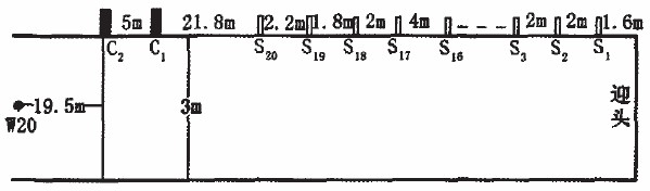 本次矿井MSP探测于2010年03月02 日在龙东矿2l试煤采区回风巷迎头有限空间内展开。测线布置巷道左帮上,采用炸药震源。其炮孔20个。接收传感器点为2个即C1、C2。传感器及炮孔顺序、方位及炮间距见图2,炮点布置在左帮。其中C1传感器距离S20号炮点21.8m,C2点距C1点5m。测点W20距离C2传感器19.5m。采集数据是KDZ1114-6B30地震仪利用两个三分量传感器C1、C2接收20炮地震数据。