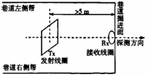 受到B905辅运巷掘进断面只有17.5m2的空间限制,采用不共面同轴偶极方式布置,如图1所示。发射线圈(Tx)和接收线圈(Rx)分别位于前后平行的2个平面内,二者相距一定距离并处于同一轴线上。发射电流为1A,发射线圈2m×2m×64匝,频率25Hz,接收线直径0.6m,发射—接收间距为7m。观测时接收线圈贴近工作面。轴线指向探测方向。探测方向分别对准巷道正前方、正前偏左、偏右等不同方向,探涮方向如图2所示。这样可获得前方一个扇形空间的信息。