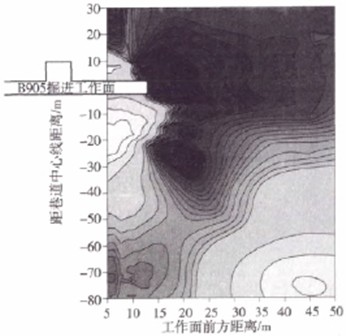 由图4可见,掘进面正前方及左帮相对富水性较强,而右帮富水性较弱。据调查资料显示,巷道附近存在小煤矿采空区,可以推测采空范围为B905辅运巷掘进面前10—25m范围内,有采空积水。