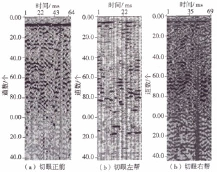 在进行多次覆盖地震勘探工作前,首先布设一条反射排列,通过探测记录了解探测区下伏介质层的赋存状况与地震地质条件等。然后在探测区布设测线,设计采用多次覆盖观测系统,使用单边激发的工作方式,采集时3道同时接收。偏移距10—50m,道间距2m,每次激发采集后,激发点与接收点依次向前移动2.5m,实现探测区内反射波的3次覆盖。在切眼处向切眼作业地点、切眼左帮及右帮进行探测,检波器置于煤帮上。探测布置如图3所示。
