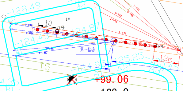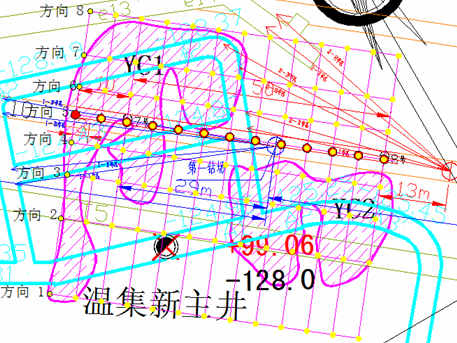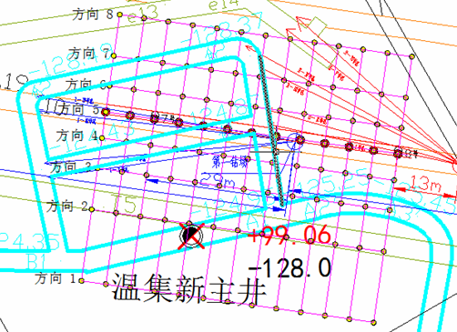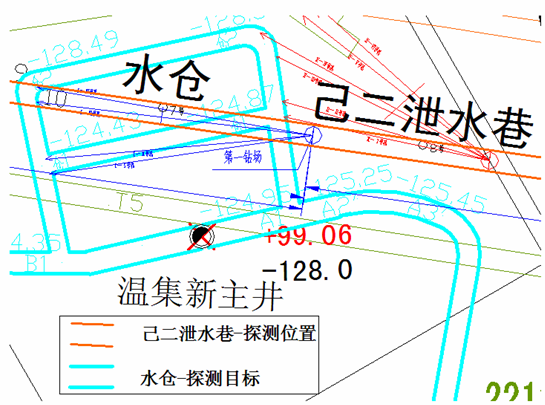 本次探测主要目的为探查己二泄水巷顶板上原有小煤矿水仓的富水性及富水范围。己二泄水巷在原有小煤矿水仓底板下20m左右层位,水仓在己二泄水巷两帮各30m左右的位置,详细见图3-1。