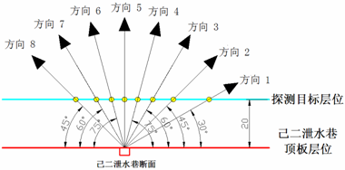 根据探测目标原有小煤矿水仓与探测位置己二泄水巷的空间关系并结合现场情况分析,拟定施工方案如下: