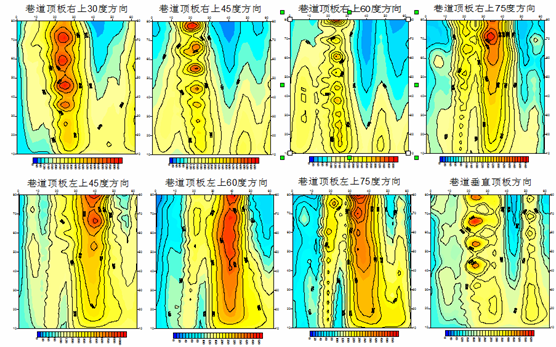4、数据分析及结果解释本次探测经过MTEM软件对各个探测方向数据进行分析可呈现各个探测方向相应的视电阻率等值线剖面。如图4-1为为己二泄水巷顶板右上30度、右上45度、右上60度、右上75度、垂直顶板方向、左上75度、左上60度、左上45度各个方向瞬变电磁探测视电阻率等值线剖面,视电阻率等值线剖面冷色调色标对应相对低阻,暖色调色标对应相对高阻,由于瞬变电磁法具有低阻屏蔽效应,因此相对低阻区域相对放大,延伸较广。