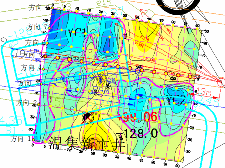 图4-3为本次己二泄水巷单巷多方向联合反演顶板上20m左右层位小煤矿水仓富水性及富水范围最终成果图,推测其中YC1和YC2区域为水仓相对富水区及范围。5、总结及建议