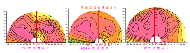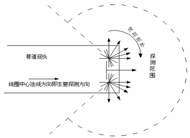 我们针对矿井西翼二水平水文地质条件复杂的实际情况,在东翼一水平严守“预测预报、有疑必探、先探后掘、先治后采”十六字方针,在西翼二水平则“逢掘必探”。以7601中顺槽为例,我们通过使用瞬变电磁探测技术和井下震波探测技术相结合的方式,选用福州华虹智能科技开发有限公司生产的YCS40(A)矿用瞬变电磁仪,在7601中顺槽横向上分别为-90°、-75°、-60°、-45°、-30°、-15°(左)、0°、15°(右)、30°、45°、60°、75°、90°七个方向,同时向迎头斜上30°、顺层和迎头斜下45°等3个角度分别探测,具体布置情况如下图1所示: