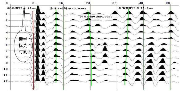 同时选用该公司生产的地震类仪器KDZ1114-6A30矿井地质探测仪,在7601中顺槽迎头位置,单点探测采集30组数据后,进行反射共偏移法探测,再采集20组数据。