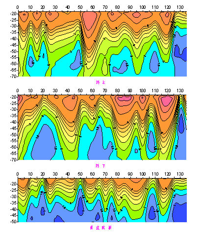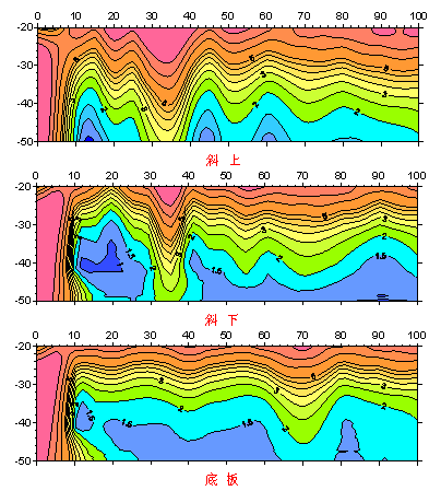 根据上述布置方式,采用华虹智能科技开发有限公司生产的YCS40(A)矿用瞬变电磁仪现场采集数据,软件处理分析,得到5602上顺槽(同时为5604下顺槽)和5604下切眼两条测线的视电阻率值剖面图,共得到6个方向上的视电阻率值剖面图,如下图8、图9所示:
