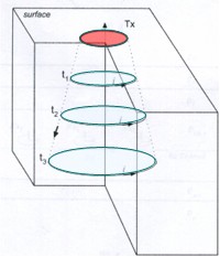 应该指出,由于电磁场在空气中传播的速度比导电介质中传播的速度大得多,当一次电流断开时,一次场的剧烈变化首先传播到发射回线周围地表各点,因此,最初激发的感应电流局限于地表,地表各处感应电流的分布也是不均匀的,在紧靠发射回线一次磁场最强的地表处感应电流最强。随着时间的推移,地下的感应电流便逐渐向下、向外扩散,其强度逐渐减弱,分布趋于均匀,感应电流呈环带分布。