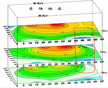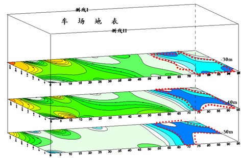 一般情况下,在同一条件下岩石的电阻率不会发生变化。但如果岩石(矿物)出现空区或者充水那么岩石的电阻率就会发生大的变化[4]。从下图中可以发现,在测线I与测线II的结尾处出现了探测视电阻率存在较大差异,在测线的70m,地表下方深部30m开始的区域,往地下延伸,存在低阻异常(红色点线区域),结合地质资料分析判断:在测线I与II结尾处灰岩溶洞较为发育,具有一定的富水性,由于此处距斜井巷道开拓位置较远,对于巷道的危险性较小,但是注意此处地表覆盖层的稳定性,以防止溶洞扩大,造成塌陷;在测线II与测线V切片结果图中,整体上都没大问题,在测线V结尾处,出现了比较明显的低阻区域,而此区域正是斜井巷道开拓的位置,推测此异常为受巷道前方溶洞发育影响。结合现场及地质资料分析:此处地势相对较高,溶洞有发育,但是发育不是很完全,斜井巷道开拓方向前方会遇到溶洞,但是此区域溶洞相对较小,富水性较弱,对于巷道开拓不会产生大的影响,建议矿上在巷道开拓时进行打钻探放水。