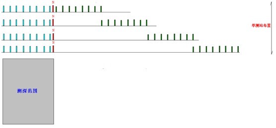 为提高本次物探结果的可靠性,根据施工现场情况及要求,特增加直流电法测深探测布置。现场共布置3条测线,由于现场地势及接触条件的影响,测线布置与瞬变电磁测线布置位置及起始点位置存在差别。每条测线布置4个测站,第一测站跑极4次,第二测站跑极3次,第三测站跑极2次,第四测站跑极1次,每条测线采集10组数据。具体测线布置位置及跑极方式如下图2-2和图2-3所示。