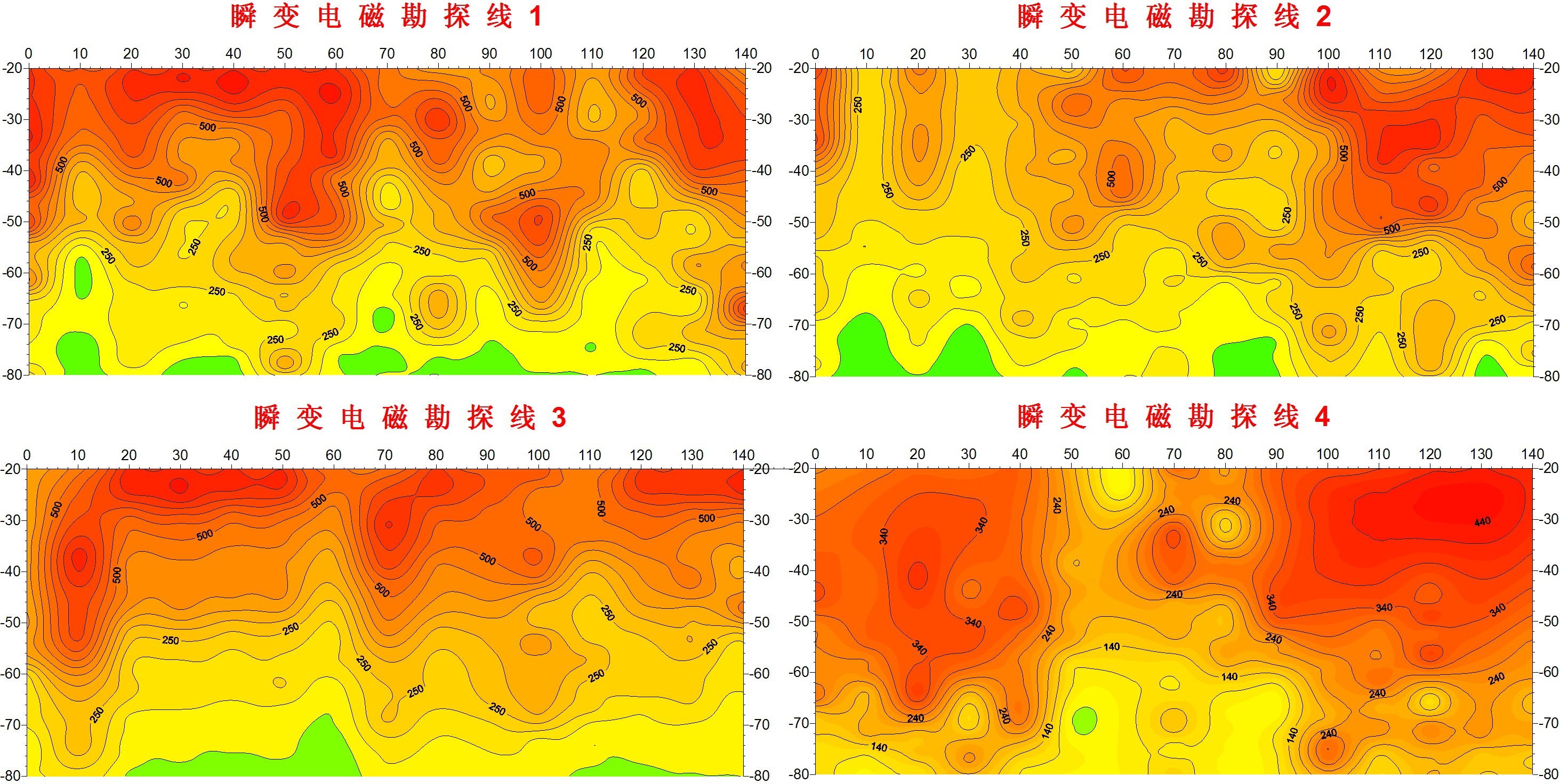 综合本次瞬变电磁及直流电法的探测结果,勘探范围内浅层区域的岩层存在一定的富水性,分析为第四系含水引起的电性变化(注:坐标以测线1的起点为原点,以东82°为x轴的正方向建立坐标)。同时在深部区域,瞬变电磁和直流电法结果都显示无明显的低阻异常区,因此推断本次勘探时,测区内的岩层裂隙不发育。