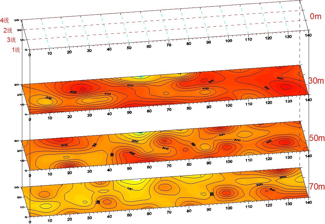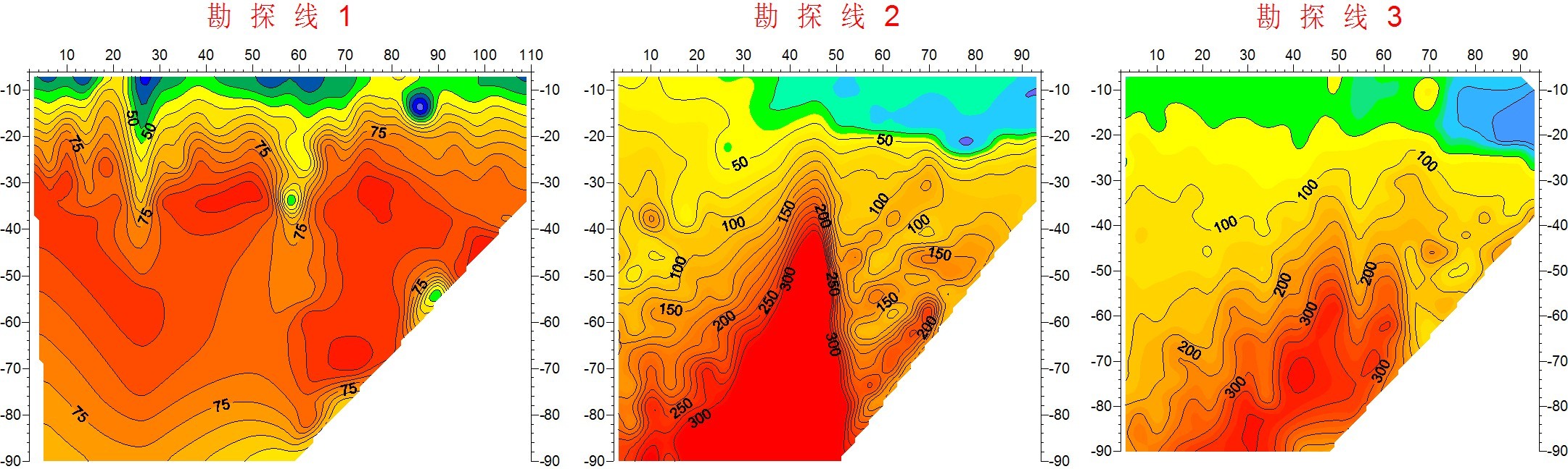 经数据处理、分析,获得探测测网范围内三条测线的视电阻率剖面图,图中不同的色调表示不同的视电阻率值,并且遵循色调从冷色调到暖色调表示视电阻率值不断升高的规律,如下图4-3所示为直流电法单勘探线视电阻率值剖面图。