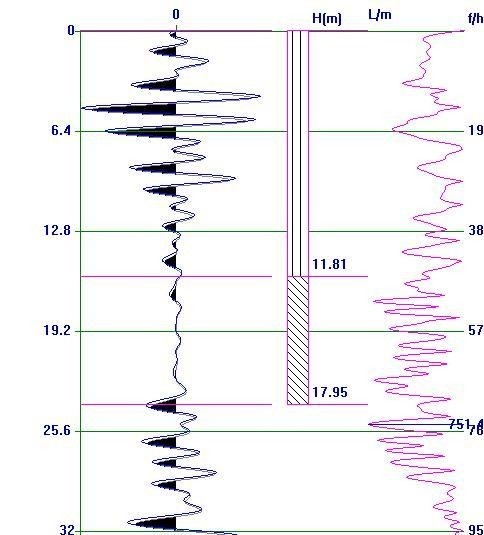 (1)案例一:探测位置位于六采区三水平右三片58层回头巷道内拐点前方15m左右,此巷是为采煤工作面下巷巷道,是过断层后的穿岩巷道,探测位置位于断层下盘内,迎头为砂岩,岩性相对破碎,为了解并寻找58层煤的位置,特进行了本次的物探(58层煤厚一般在0.8m-1m左右,倾角一般在20°-35°之间)。