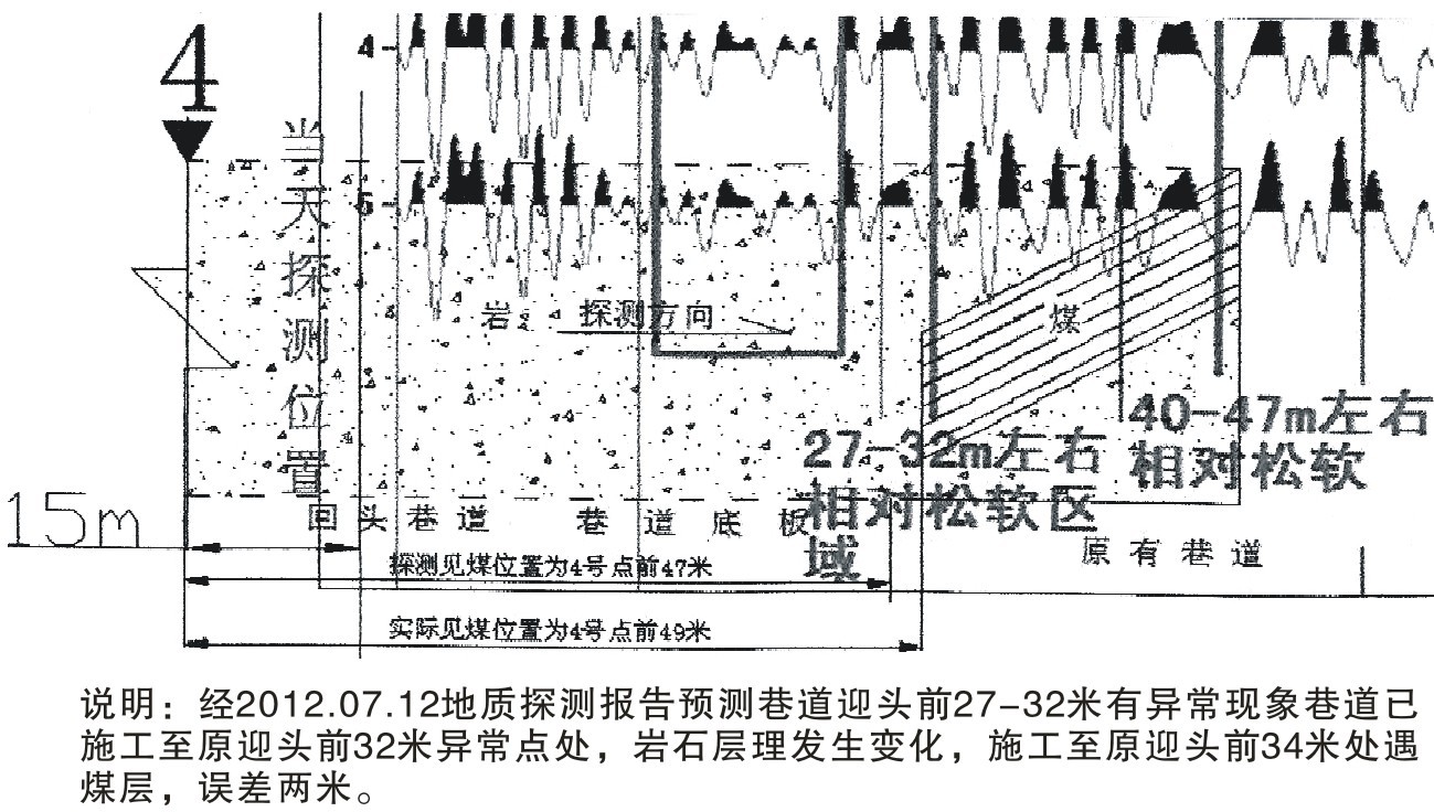 (1)案例一:井区工作队对六采区三水平右三片58层回头巷道迎头超前探测异常位置进行了验证,经掘进验证,在物探探测位置(4#测点前15m)前掘34米(4#测点前49m)时见煤,与物探预测预报的的32米(4#测点前47m)异常点距离相差2米。故误差为2米。(验证情况如图八)