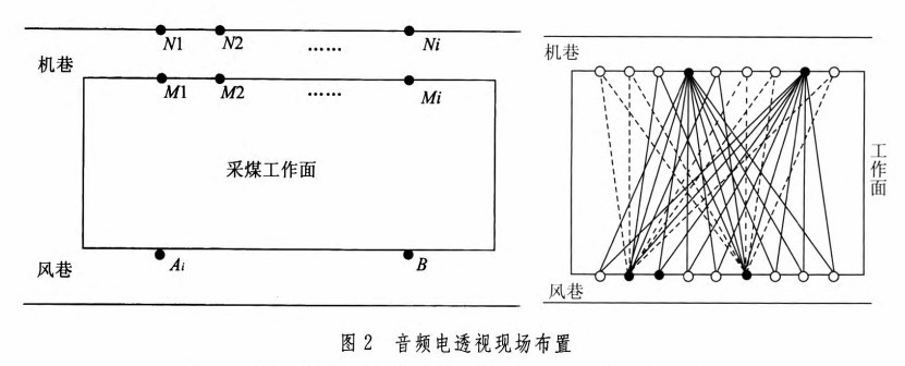 2)音频电透视技术。20世纪90年代国内由西安研究院开发了矿井直流电透视方法,进一步升级为矿井音频电透视技术。音频电透视法属于直流电偶极接地探测技术,其电场分布于地下层状全空间,电流沿最小路径流动,属体积勘探。该方法主要用于查明工作面内顶底板一定深度范围内的含水、导水构造及其富水区域分布范围,可进行含水层富水块段探测,工作面底板注浆效果评价。工作方法采用单极一偶极法,A、B为供电电极,用于向岩层供电,M、N为测量电极,MN位于同一巷道,垂直于巷道走向布置,A极位于另一巷道中,B极处于无穷远处(图2)。