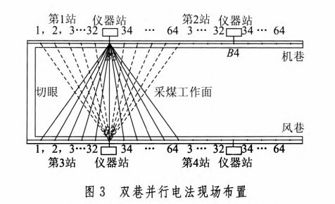 对于矿井工作面地质异常的精细探测,通常采用双巷并行三维电法。电极布置在煤层底板或顶板通常可反映煤层相应底板或顶板范围的电性分布情况,以达到探测相对富水区分布范围。通常在机巷和风巷中分别沿巷道顶板或底板位置布置电法测线系统(图3),利用并行电法仪采集各巷道内电法测线的电位变化情况。数据采集用AM法,每站数据测线上各供电电极与对面巷道对应B极形成地电场,从1号电极到64号电极,逐点供电扫描一遍,形成扇形射线区(图3),其余电极同步测量各点的自然电场、一次场和二次场的电位变化情况,获取大量的参数,达到对探测区域的多次覆盖,大大提高电法探测效率。