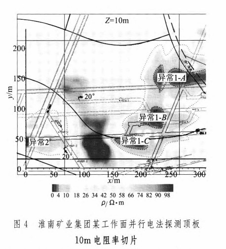 3)并行电法采用一次布极,自动采样,未对各个电极间的极化效应进行深人研究,没有给出确定的定量探测深度和穿透距离,仅给出探测有效最大侧向范围为AB/2,没有定量进行煤层正下方或上方的富水评价,只是通过测线正下方或上方的体积效应来推断煤层正下方或上方的富水性。应该深入进行理论分析得出定量的探测深度和测线之间的关系以及煤层正下方或上方的富水与测线空间位置的关系。