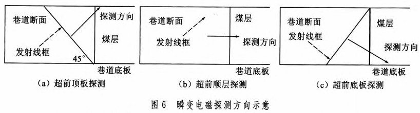 3)瞬变电磁法。瞬变电磁法(Transient Electromagnetic Methods,TEM)又称时间域电磁法(Time Domain Electromagnetic Methods,TDEM)。它与其它测深方法相比,具有探测深度大、信息丰富、工作效率高等优点。自20世纪50年代以来,该方法得到迅速发展,特别是对探测高阻覆盖层下的良导电地质体取得了显著的地质效果。其探测原理是:在发送回线上供一个电流脉冲方波,在方波后沿下降的瞬间,产生一个向回线法线方向传播的一次磁场,在一次磁场的激励下,地质体将产生涡流,其大小取决于地质体的导电程度,在一次场消失后,该涡流不会立即消失,它将有一个过渡(衰减)过程。该过渡过程又产生一个衰减的二次磁场向掌子面传播,由接收回线接收二次磁场,该二次磁场的变化将反映地质体的电性分布情况,从而判断地下不均匀体的赋存位置、形态和电性特征。矿井工作面瞬变电磁法在煤矿井下工作面巷道内进行,测点间距2~20m之间。根据线框发射电磁场的方向性,可认为线框法线方向即为瞬变电磁探测方向。因此,将发射、接收线框平面分别对准煤层顶板、底板或平行煤层方向进行探测,就可以反映煤层顶、低板岩层或平行煤层内部的地质异常(图6)。