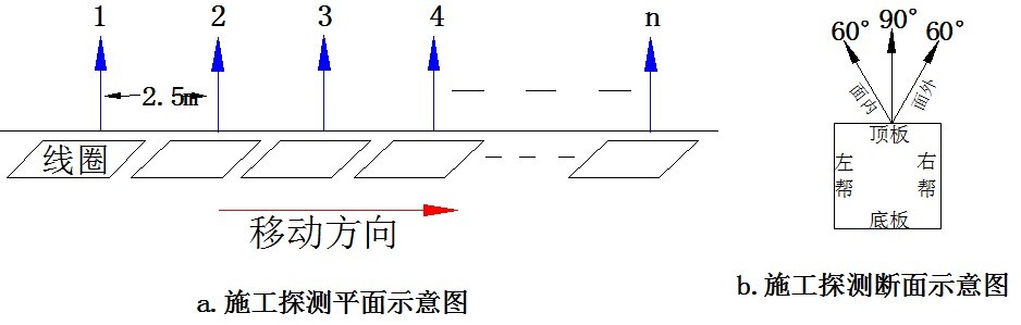 由于根据采掘空间断面的大小选择发射和接收回线边长后,仍可通过加大发射功率和接收回线匝数的方法增强二次场信号的强度,从而增大瞬变电磁法的顺层或垂直勘探深度,因此该方法在克服井下施工空间的局限性方面具有明显的优势。