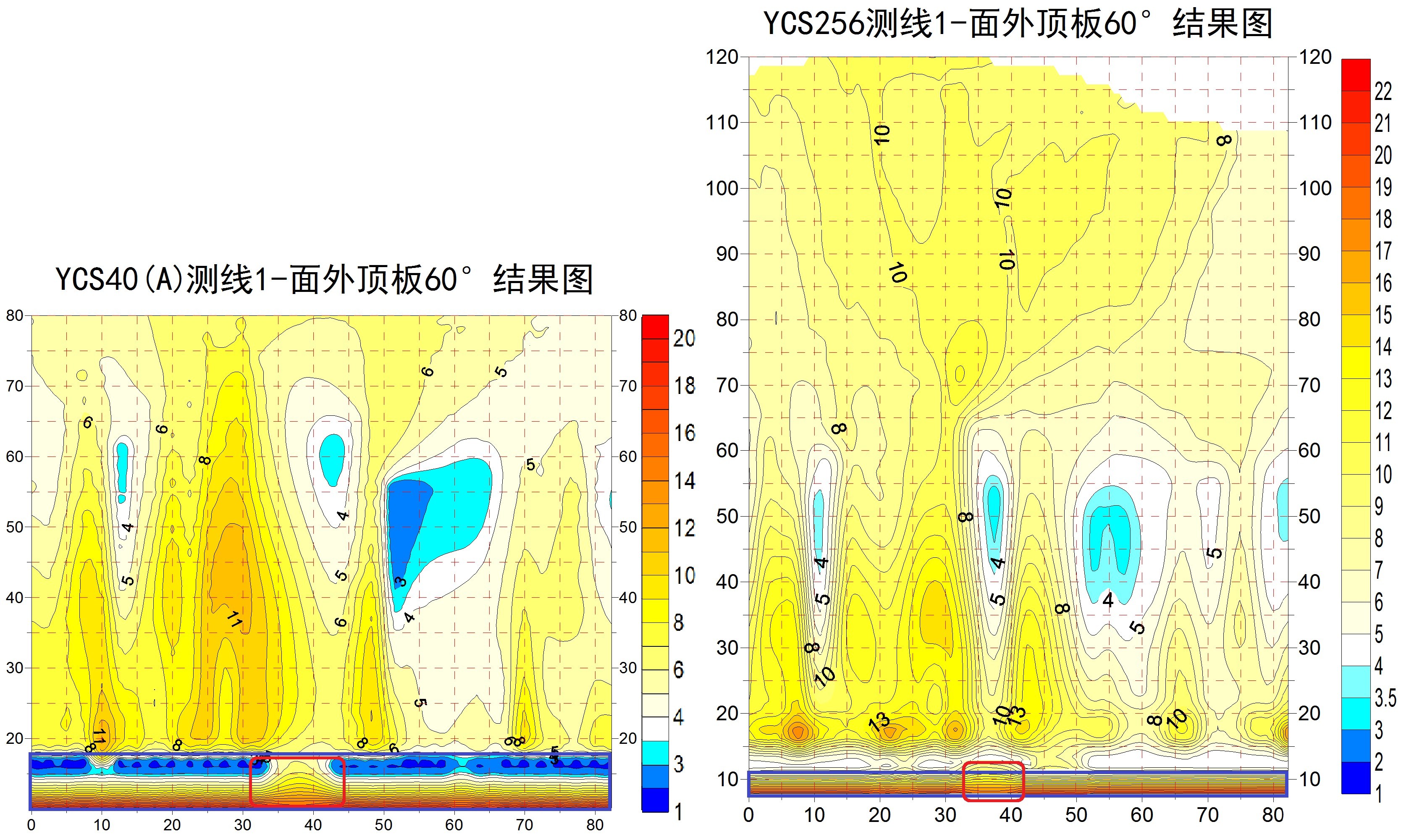 本次YCS40(A)型矿用瞬变电磁仪与YCS256型矿用本案型瞬变电磁仪于2013年8月31日采集的数据进行了对比分析,分别生成了面外顶板60°视电阻率拟断面成果对比图、面外顶板90°视电阻率拟断面成果对比图、面内顶板60°视电阻率拟断面成果对比图,如图5-1、图5-2、图5-3所示,并针对三组对比成果图进行综合分析。